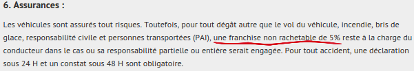 La plupart des compagnies de location de voitures n’expliquent pas clairement la franchise dans leurs termes et conditions. Ils laissent l’information très vague en citant seulement qu’il y a une franchise et ne déclarent pas le montant, ou bien ils précisent que le montant de la franchise est égal à un pourcentage quelconque de la valeur du véhicule, ce qui n’est pas claire, puisque le client bien-sur ne sait pas la vraie valeur de la voiture.
